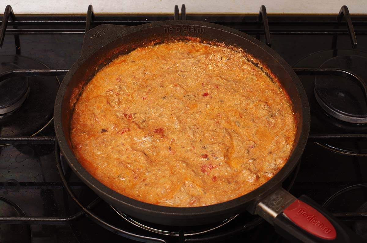 Шаг 4. Отварите в подсоленной воде пасту. Переложите ее в сковороду, влейте сливочную смесь и тушите, помешивая, пока соус немного не загустеет.