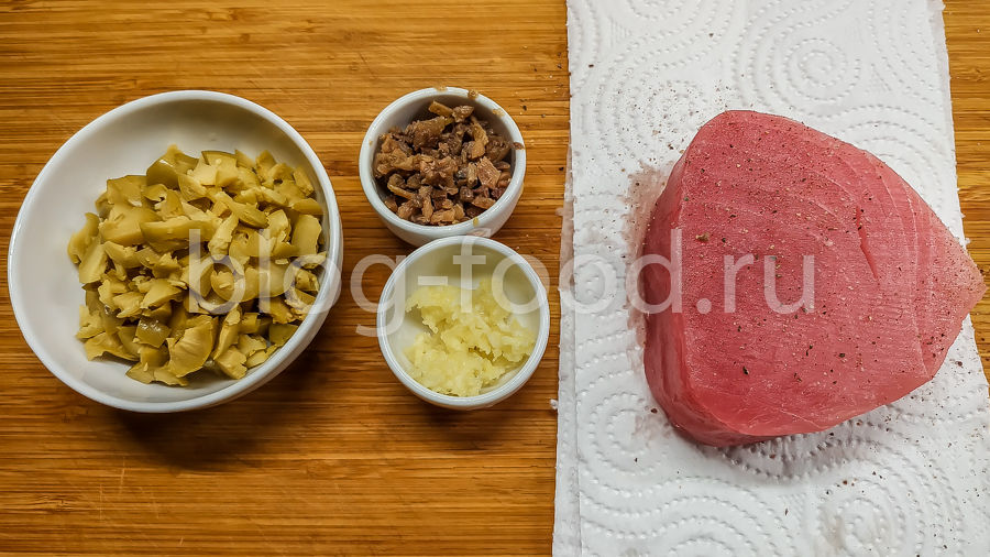 Из оливок удаляем косточку, режем небольшими кусочками. Анчоусы рубим мелко, чеснок давим. Рыбу обсушиваем салфетками, солим, перчим по вкусу.