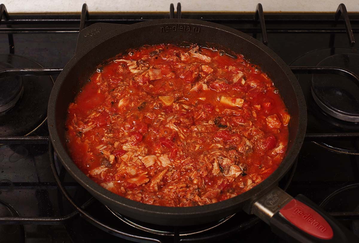 3. Добавляем тунца в собственном соку (в оригинальном рецепте — в масле). 20 минут тушим все это на сковородке под крышкой.