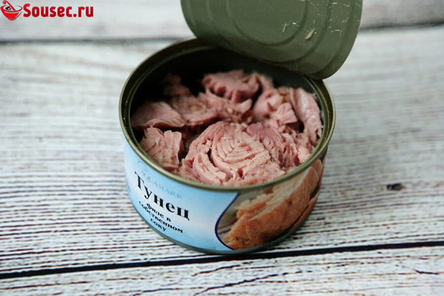 Кстати, консервированный тунец я брала салатный. Он уже измельчен. Если у вас тунец большими кусками, его надо достать из жидкости и размять вилкой. Тунец может быть консервированный в масле или в собственном соку. Мне больше нравится в масле.