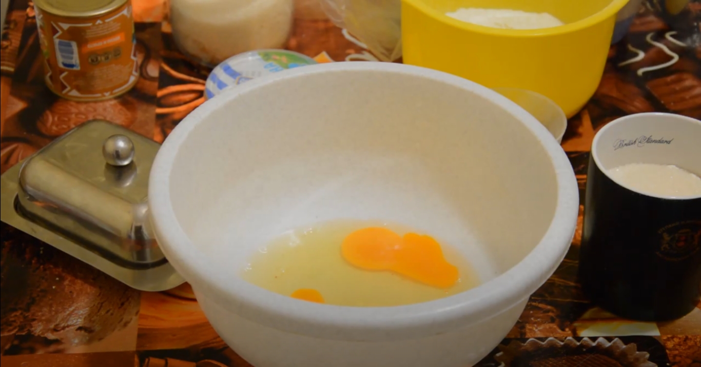 - Остудить маргарин с сахаром, добавит к нему кефир, яйца, муку, сгущеное молоко. Все взбить при помощи миксера.