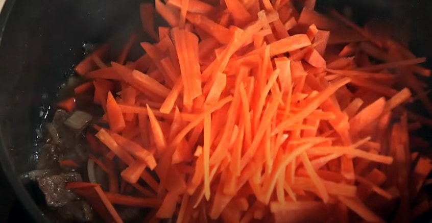 Пока жарится свинина, очистите 1-2 крупные морковки. Подойдет старая, а не молодая морковь. Ее можно не жалеть, она придаст красивый цвет плову и фирменный вкус. Нарежьте ее тонкой соломкой — нарезка традиционная для приготовления плова. Измельчать на терке крайне не рекомендуется. К обжаренному мясу закладываем морковь и продолжаем готовить на сильном огне. Примерно через 3-4 минуты аккуратно перемешиваем, чтобы не разломать морковку. И продолжаем обжаривать еще минут 10-15, до золотистого цвета.