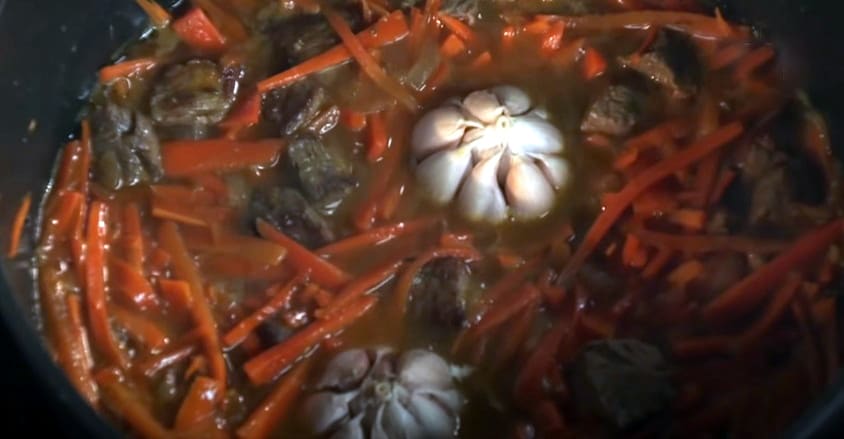 Добавляем в казан немного кипятка, надо, чтобы овощи и мясо потушились. Закрываем крышкой.