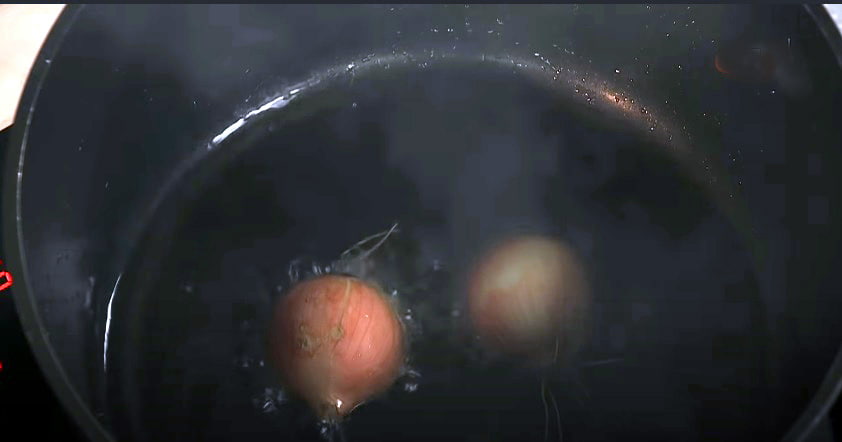Теперь слегка очищаем луковицу от шелухи (полностью не нужно), разрезаем пополам и бросаем их в курдючный жир. Лук должен перекалиться. Когда луковица поменяет цвет, станет темно-коричневой, с помощью шумовки удаляем из казана.