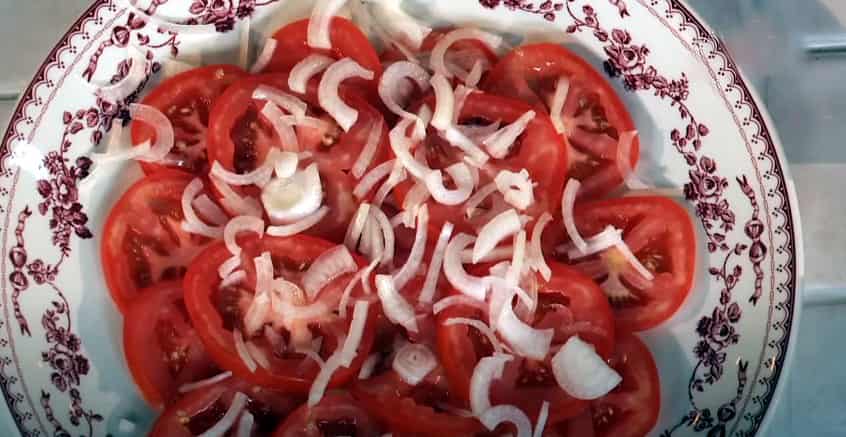 Для салата потребуется большая плоская тарелка. Помидоры (на мой вкус самые сочные и нежные — розовые сорта) вымоем. Берем острый нож и нарезаем томаты кружочками достаточно тонко. Выкладываем нарезку на всю ширину блюда.