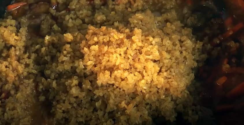 - Когда овощи с мясом слегка подрумянятся, засыплем к ним порцию булгура. Перемешаем.