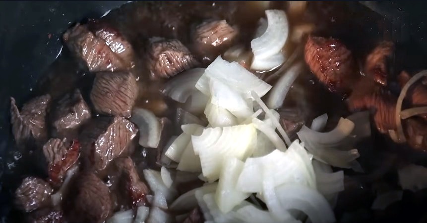 В хорошо разогретое масло закладываем репчатый лук. Лука потребуется много, 2-3 крупные головки. Его нужно нарезать тонкой соломкой, опустить в кипящее масло и обжарить до уверенного золотистого цвета. Лук должен потерять влагу и стать золотистым, в противном случае мясо будет не жариться, а тушиться. Не сожгите лук!