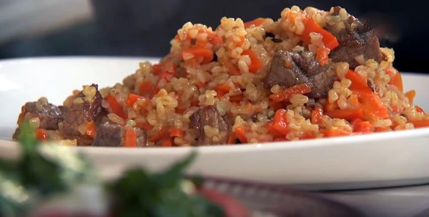 - Спустя указанное время крупа хорошенько разварится, и аппетитный плов из булгура можно подавать к столу.