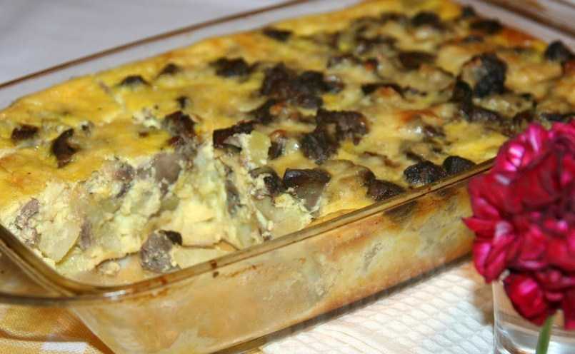 - Форму смазываем жиром и первым слоем выкладываем пол порции обжаренного субпродукта с овощами.