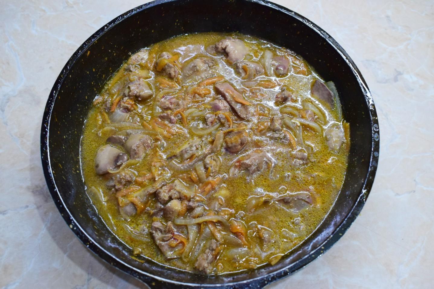 Как только овощи станут мягкими, выложите к ним кусочки куриной печени.