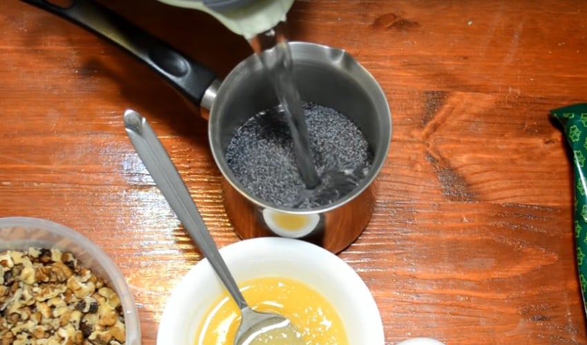 - Мак насыпьте в сотейник, залейте кипятком и выдержите 20–30 минут.
