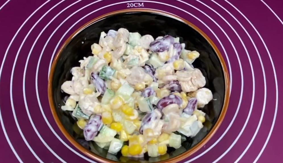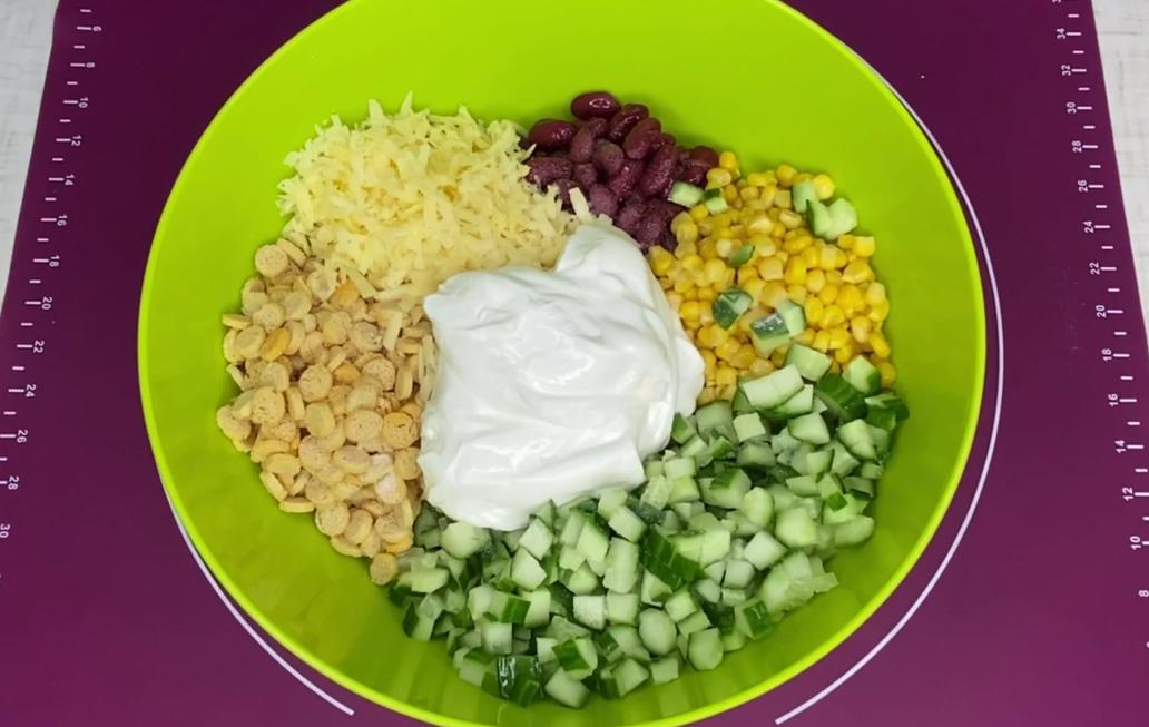 Консервированная фасоль прекрасно сочетается с кукурузой и сочными огурцами. Закуска заправляется сметаной, поэтому считается низкокалорийной и очень вкусной. Добавление твердого сыра делает ее аппетитнее, а сухарики пикантно похрустывают на зубах.