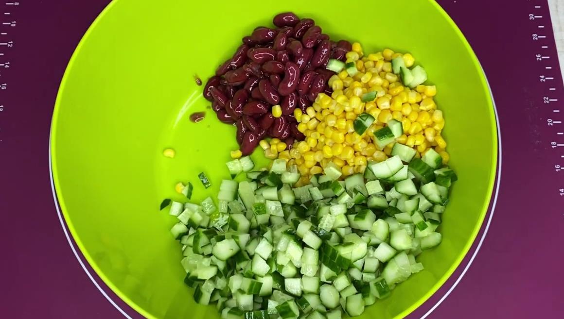 Слить с фасоли и кукурузы рассол, смешать бобовые в глубокой емкости. Добавить огурец, нарезанный мелкими кубиками.