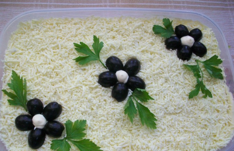 И в завершении засыпаем наше кушанье тертыми желтками. Этот слой является не только составляющей частью салата, но и украшением блюда. Рассыпчатые пушистые ярко-желтые крошки очень напоминают махровые цветы, в честь которых это блюдо получило свое название. Не снимая формы и накрыв сверху пищевой пленкой, отправляем наше кушанье в холодильник на 1-2 часа, чтобы оно настоялось и пропиталось.