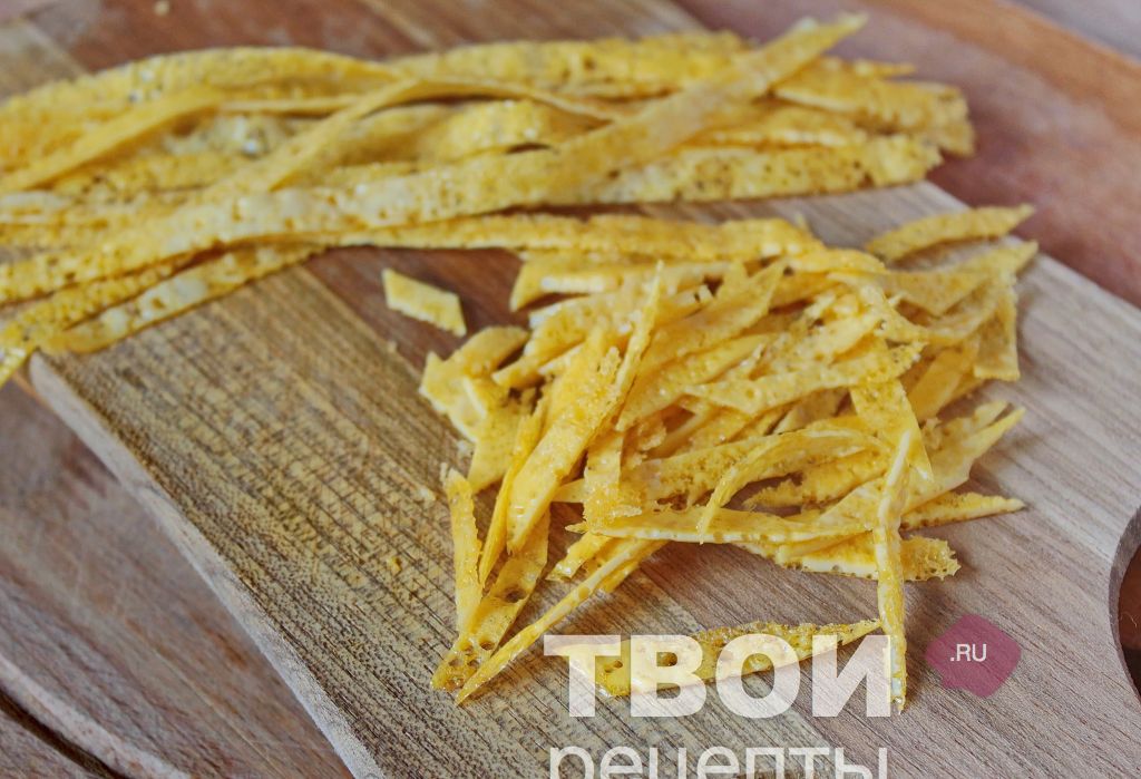 Готовый остывший картофель чистим от кожуры и измельчаем соломкой.