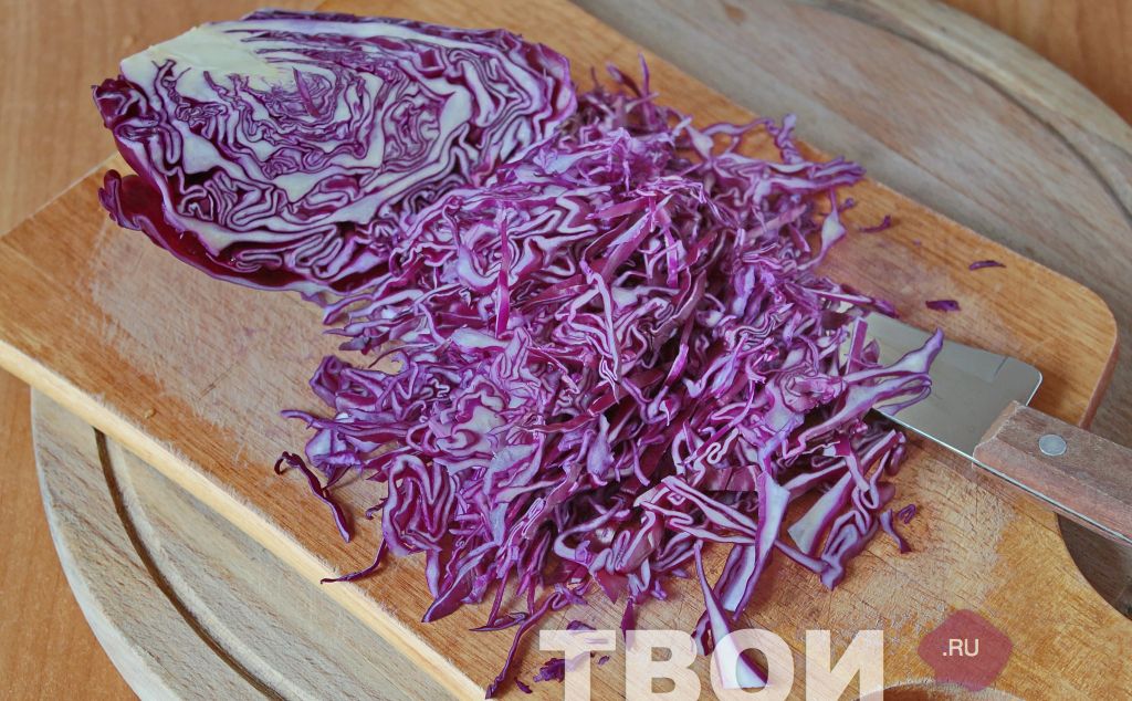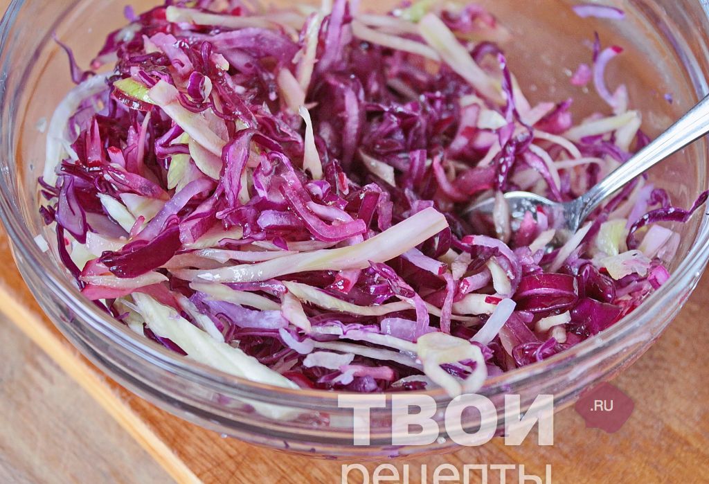 - Капусту нашинковать, присыпать солью, немного размять вилкой или руками.