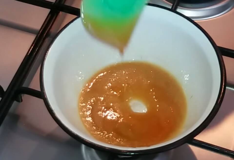 Выливаем в нее сахар, мед и воду. Перемешиваем и включаем медленный нагрев. Постоянно помешивая уваривать нужно до загустения массы и появления красивого оттенка.