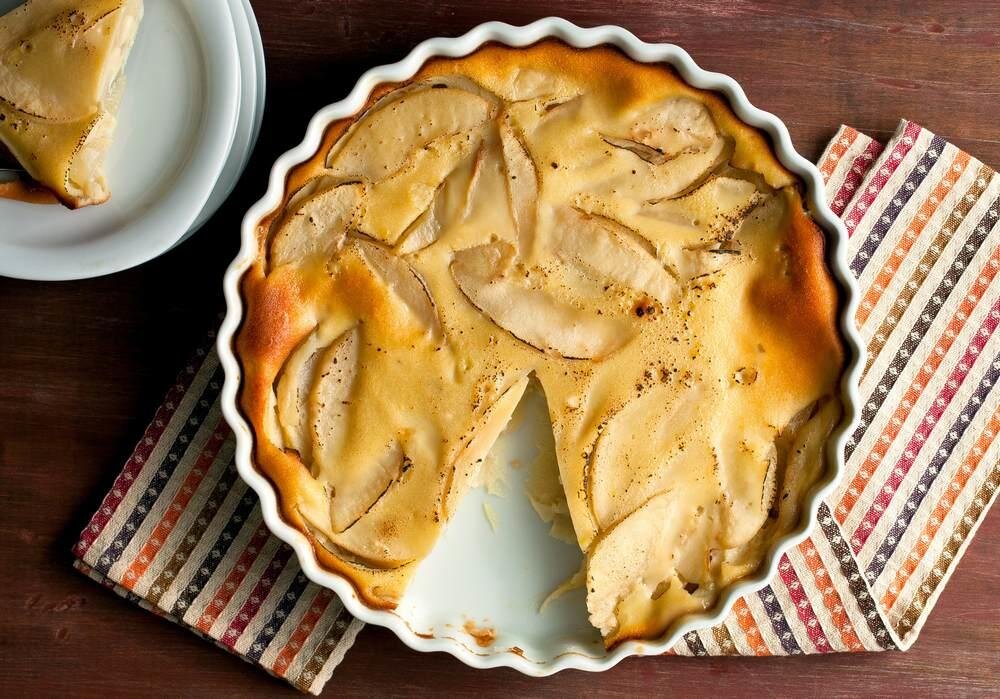 - Форму для запекания смажьте сливочным маслом, выложите в нее груши, залейте их тестом.