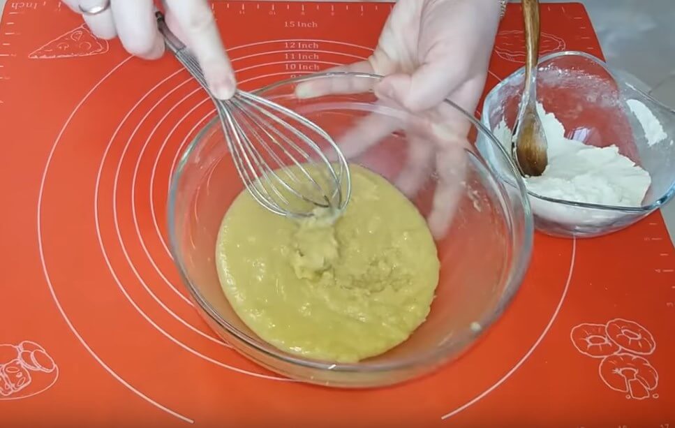 - Добавьте муку, взбейте до однородности.