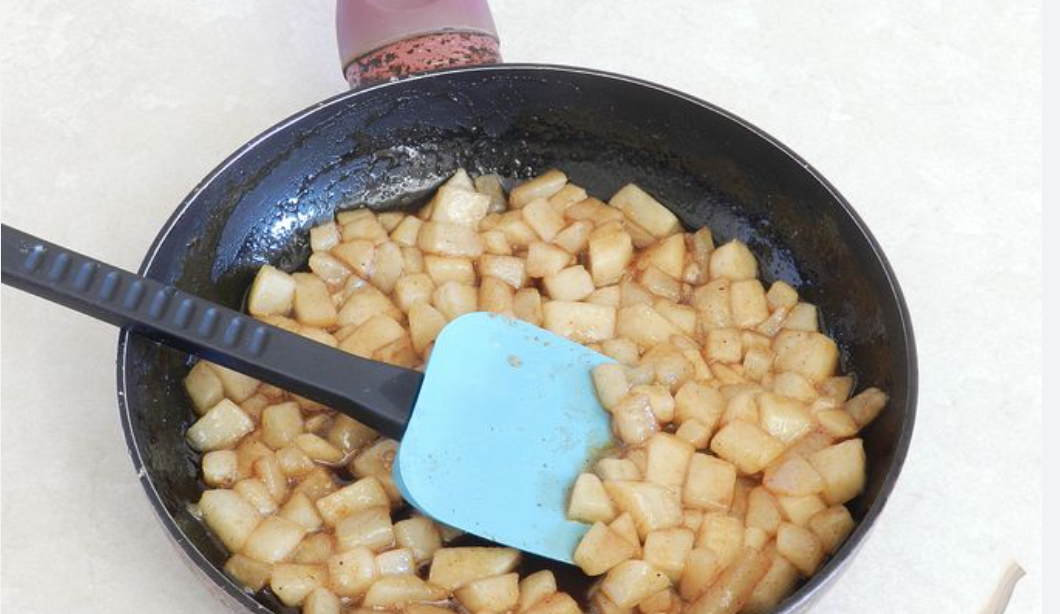 - Очистите и мелко нарежьте фрукты. Вмешайте ложкой, добавьте щепотку корицы.