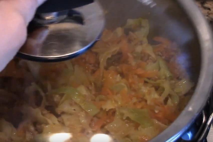 После добавления всей капусты, немного подсаливаю и прикрываю сотейник крышкой, даю пропариться. Это нужно сделать для того, чтобы капуста пустила сок, тогда не придется доливать воды в процессе тушения. Но может попасться не очень сочный кочан, в этом случае воду необходимо по чуть-чуть подливать.