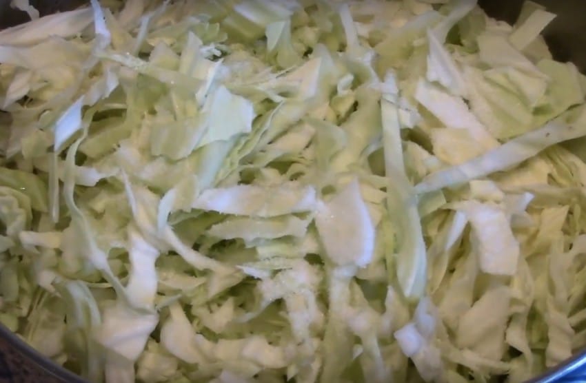 - Затем колбасные изделия и свинину необходимо смешать с капустой и луком.