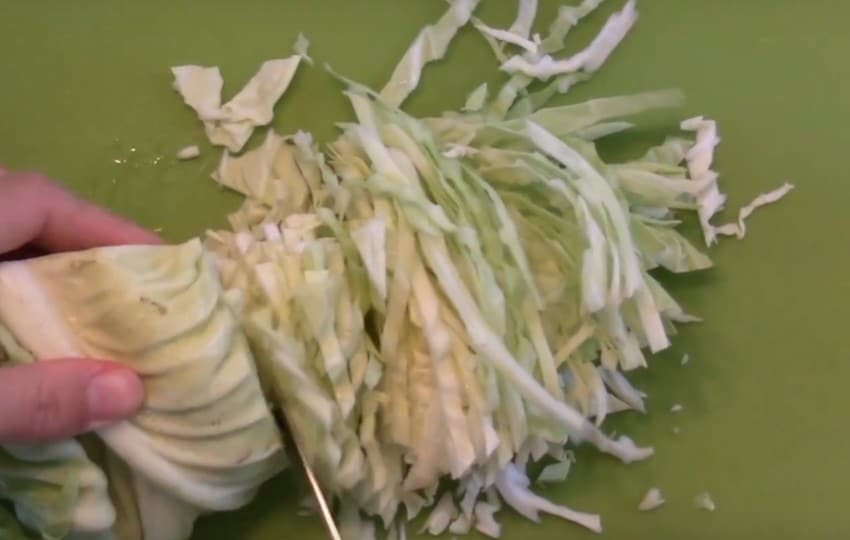 Начнем с капусты. Я шинкую ее достаточно тонко. Технология проста. Кочан режется пополам, затем кладется срезанной частью вверх так, чтобы один из краев среза прижимался к доске. Фиксируем кочан левой рукой. И принимаемся мелко шинковать, срезая ножом тонкие пластинки сверху вниз.