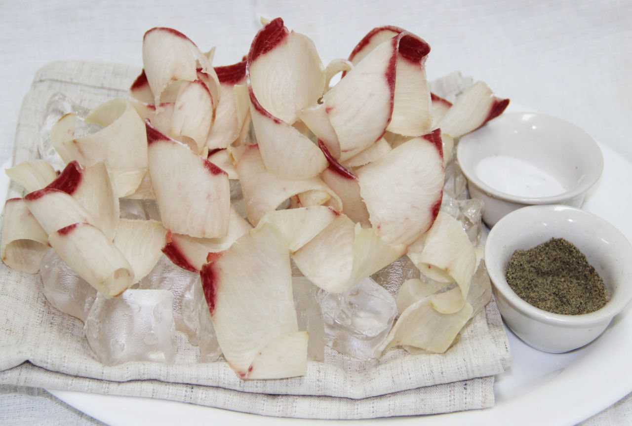 Строганину можно делать только из жирной рыбы (лучше всего из лососевых видов), не погибшей в сетях и, самое главное, не замороженной в морозильной камере — иначе чипсы будут иметь очень неприятный водянистый вкус.