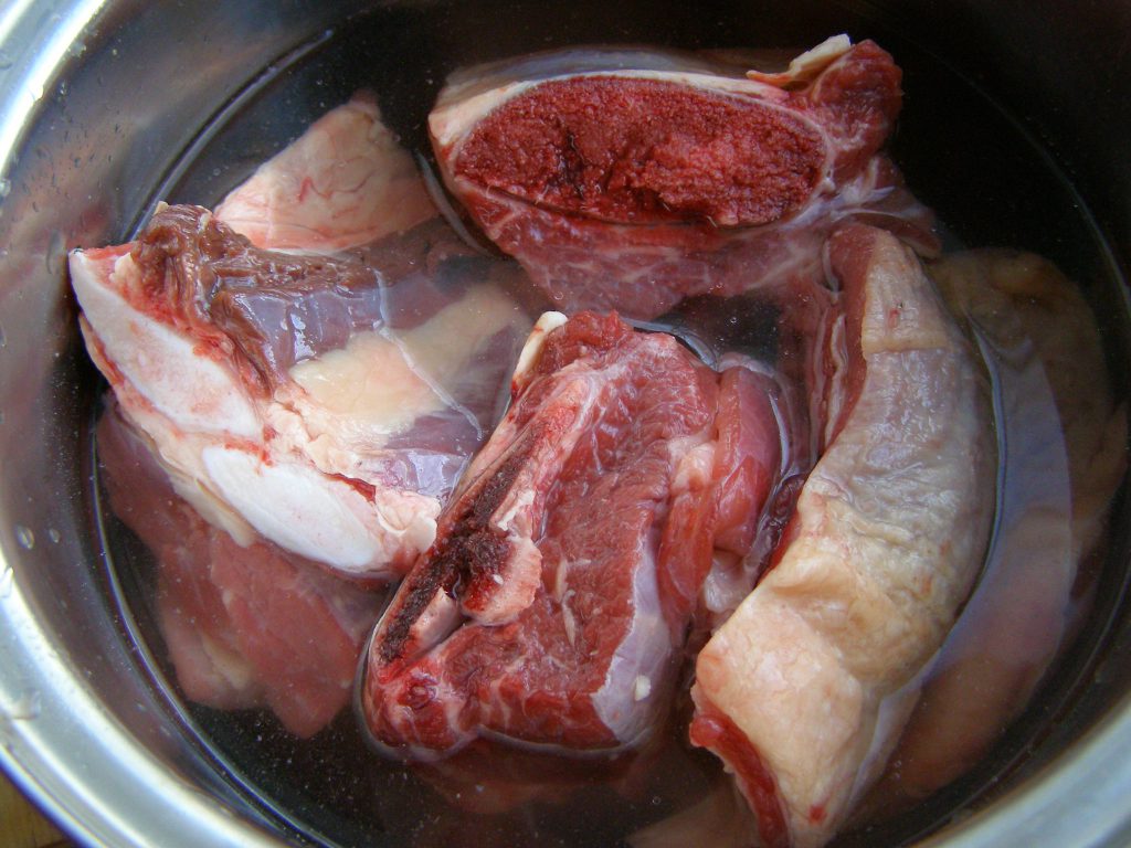 Итак, промоем кусок мяса (оно должно быть свежим, жаль, если размороженное, хотя тоже не беда). Нарубим на нужные куски. И зальем водой на время. Кулинары считают, что в эти моменты из мяса уходят неполезные вещества, которым могли его накачать недобросовестные продавцы.