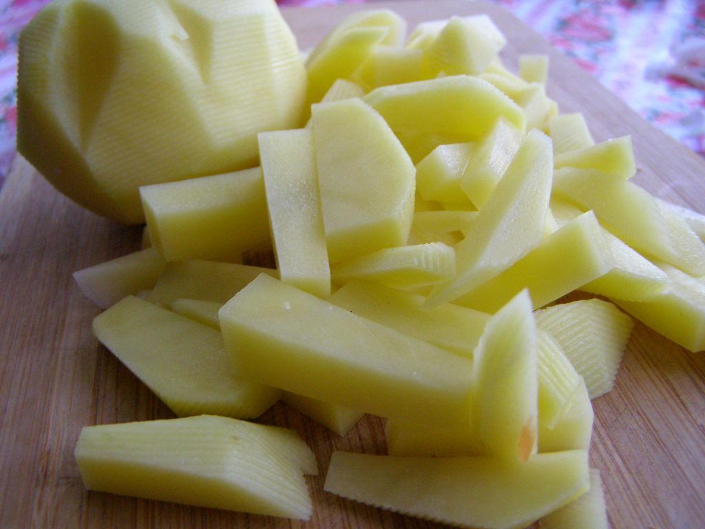 - Картофель почистите и порежьте на небольшие кусочки. Сразу отправляйте в кастрюлю. Пусть варится.