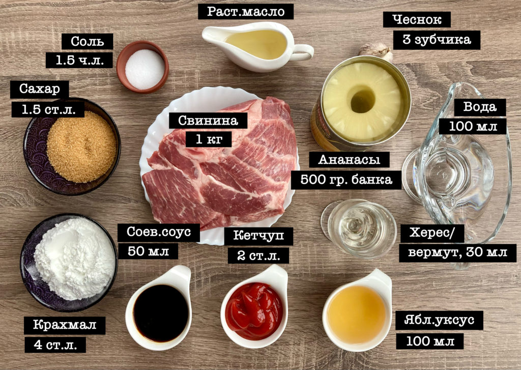 1 кг свинины; банка консервированных ананасов (500 гр.); 2 столовые ложки кукурузного крахмала; 1.5 ч.л. соли; растительное масло для обжаривания; острый перец (по желанию). Для маринада: 30 мл соевого соуса; 30 мл хереса/вермута или вина. Для соуса: 20 мл растительного масла; 3 зубчика чеснока; 100 мл яблочного уксуса; 2 ст.л. кетчупа; 20 мл соевого соуса; сироп из банки с ананасами; сахар, соль — по вкусу; 100 мл воды; 2 ст.л. кукурузного крахмала.