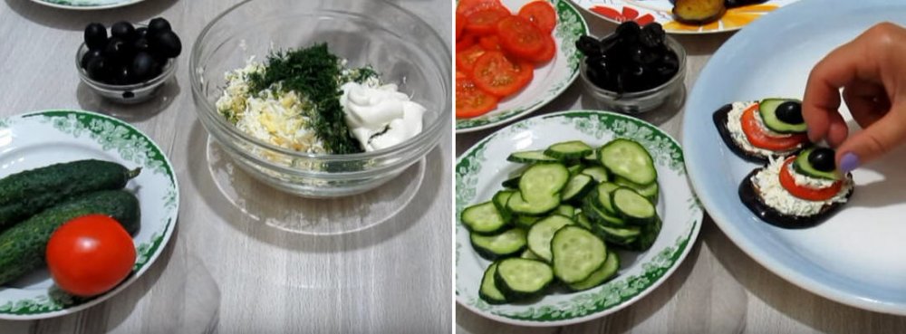 Помидоры и огурцы нарезаем тонкими ломтиками, а маслины — пополам. И начинаем выкладывать «павлиний хвост» — берем ломтик баклажана, смазываем сырным соусом, на него слайс помидора + соус, дальше огурчик + соус, и сверху кладем маслинку. Её тоже можно чуть чуть мазнуть соусом, чтобы не сказывалась с огурца.