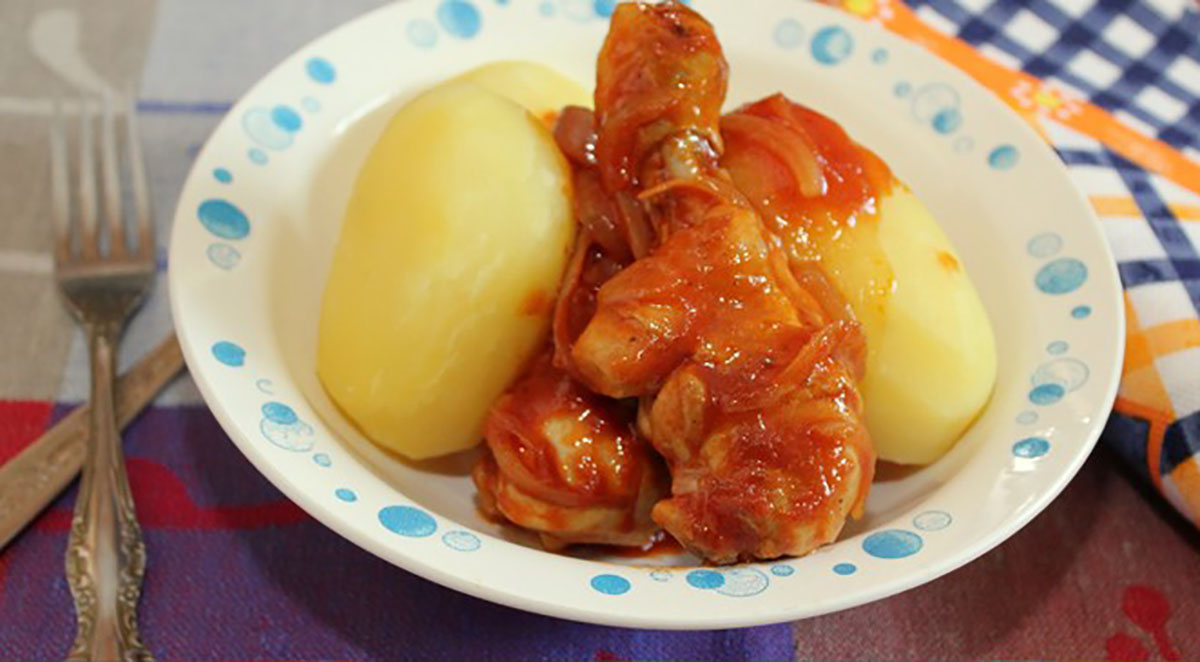 Очень простое и быстрое блюдо. Потушите куриные бедра с томатом и луком. Отварите картошку.