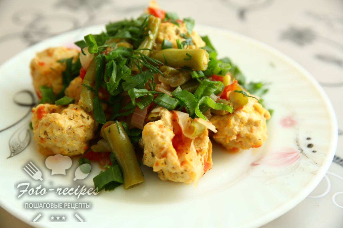 Выложите фрикадельки на сковороду (или в мультиварку). Добавьте накрошенные овощи. Тушите под крышкой 25 минут. За 5 минут до готовности засыпьте стручковую фасоль и мелко рубленный чеснок.