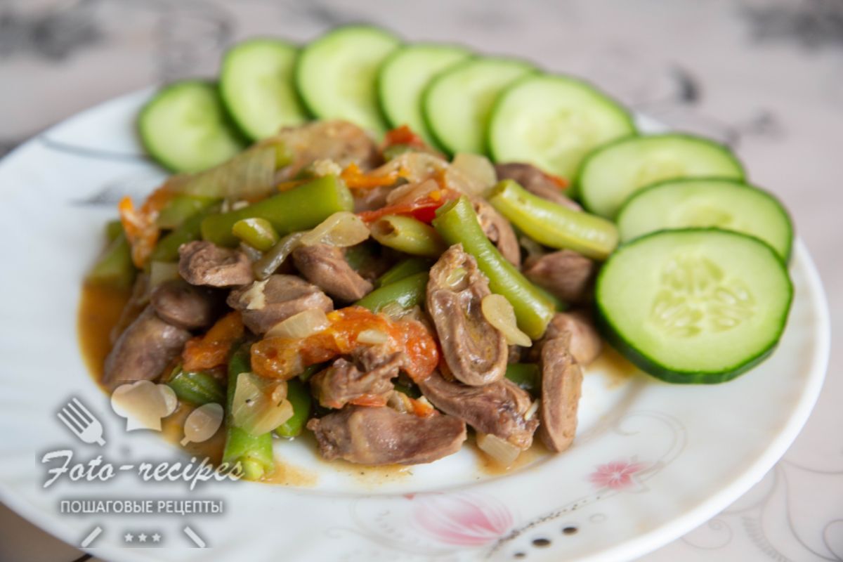 Потушите куриные сердечки с луком и помидором. За 5 минут до готовности добавьте стручковую фасоль. К готовым сердечкам нарежьте свежий огурец.