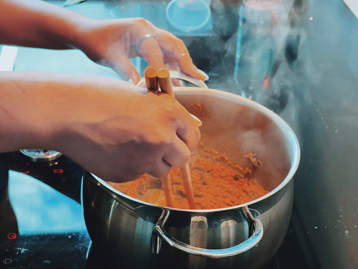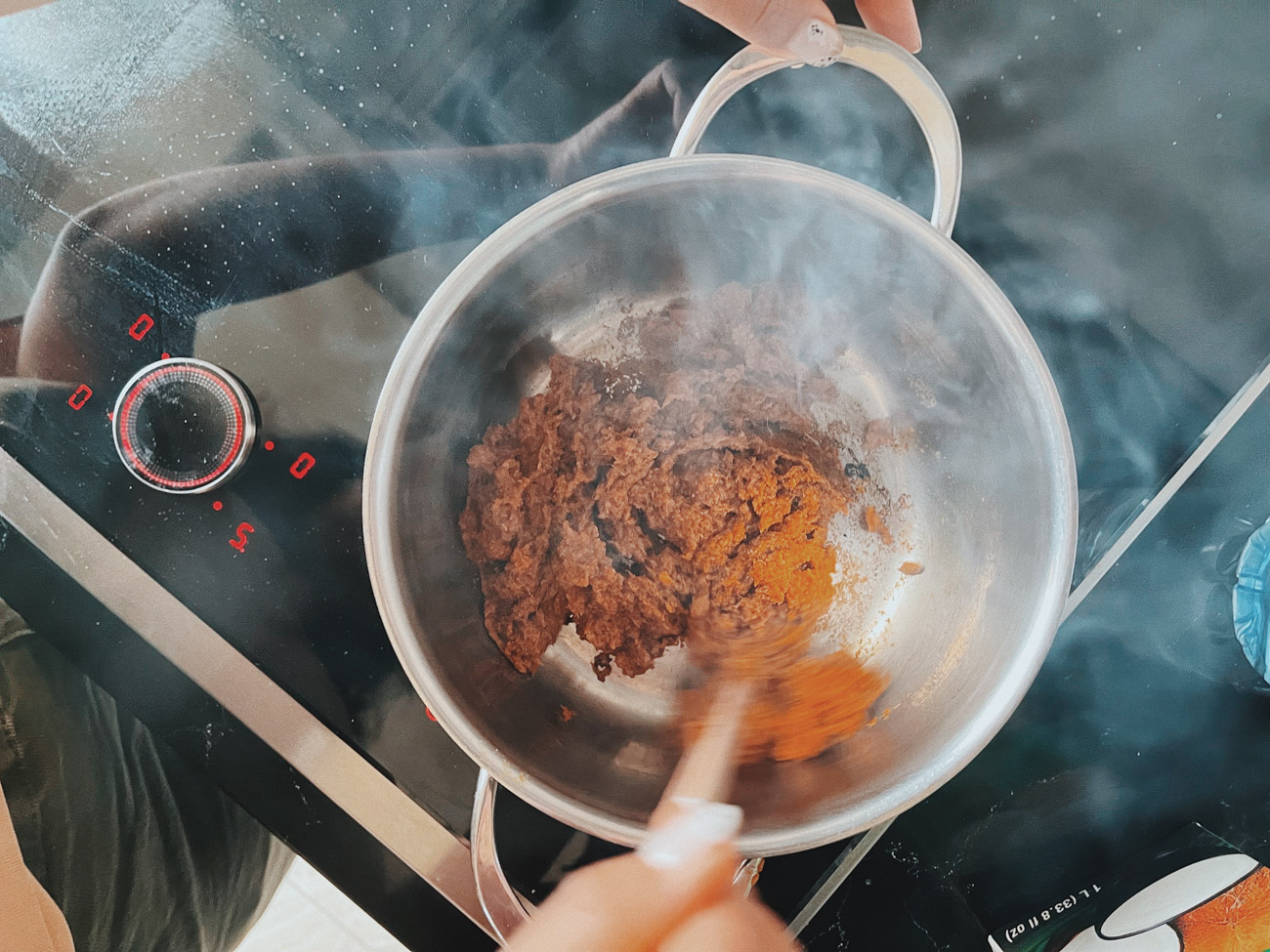 Повторно смешиваем все блендером. Затем избавляемся от избытка влаги. Нагрейте сковородку или кастрюлю на плите и без добавления масла (а главное — постоянно помешивая) выпарите жидкость из пасты.
