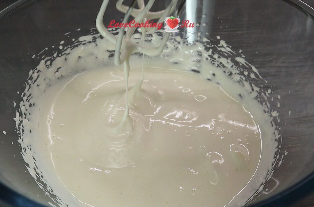 Миксер не останавливаем, потихоньку добавляем варёную сгущёнку