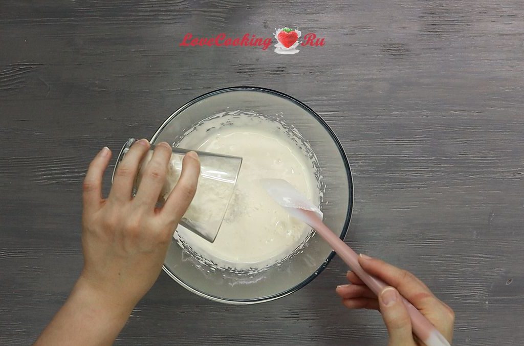 - Добавляем муку и тщательно перемешиваем венчиком до получения однородной массы.