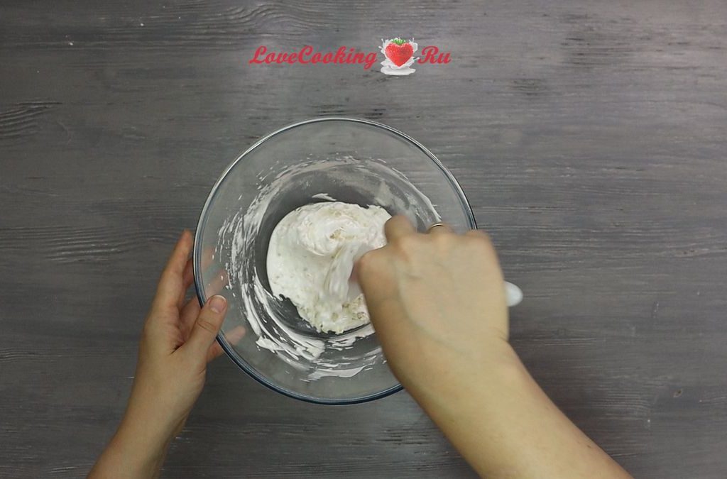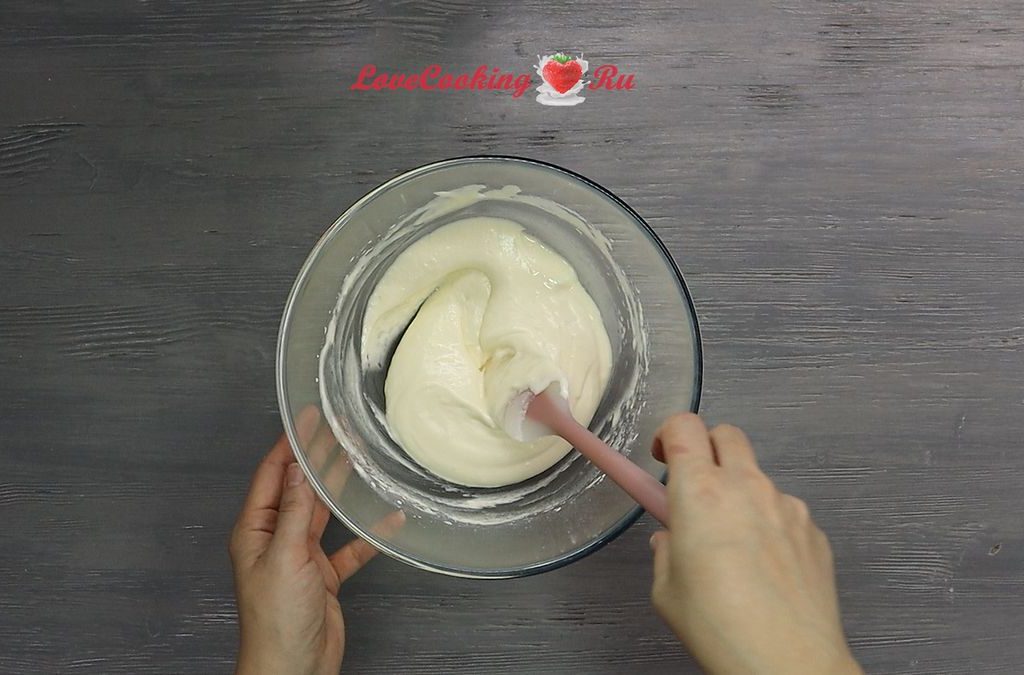 - Часть курда отложи, а часть – взбей блендером с маскарпоне. Взбей сливки до пышности и соедини обе массы.