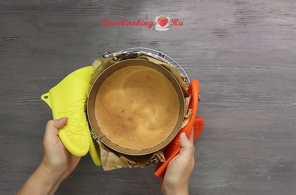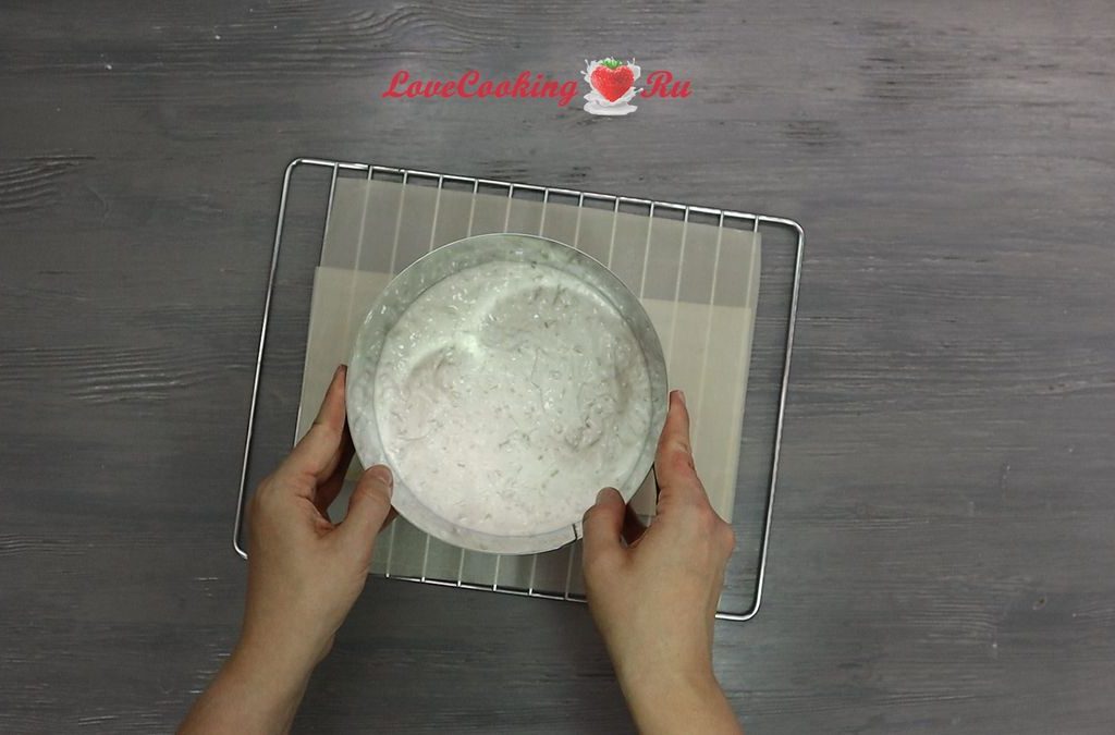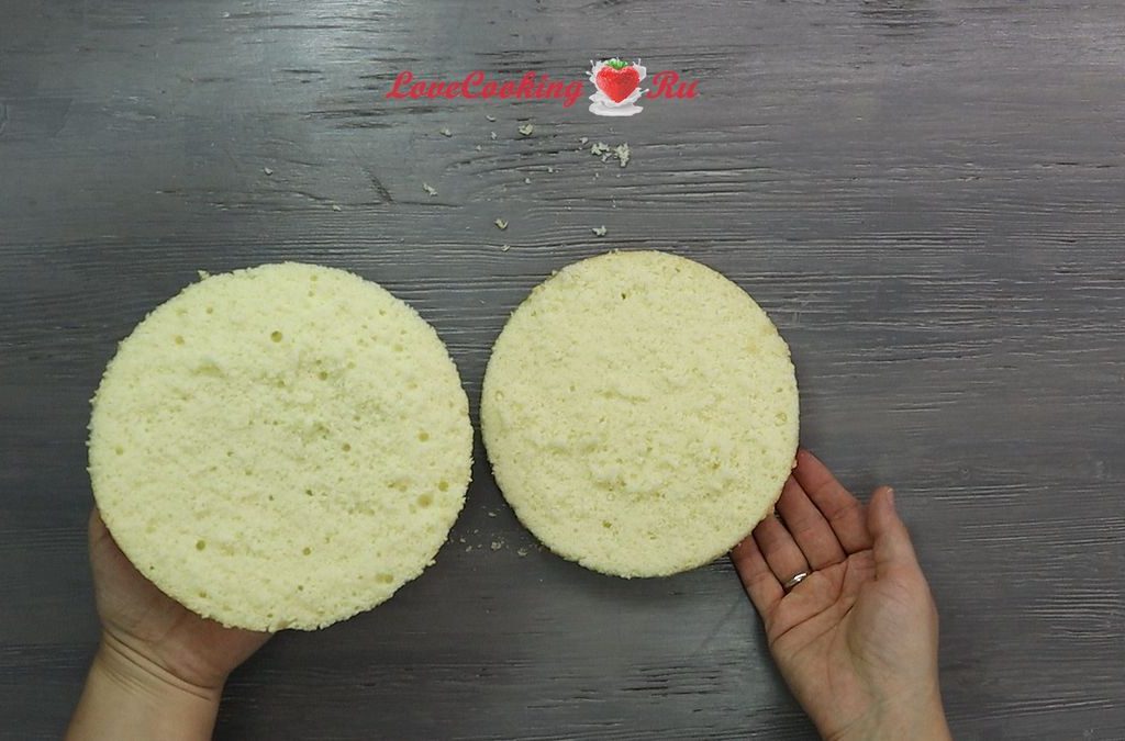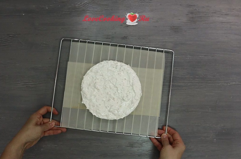 - Выложи обе заготовки кругом на пергамент и выпекай коржи до 1.5 часов в духовке при 100 градусах.