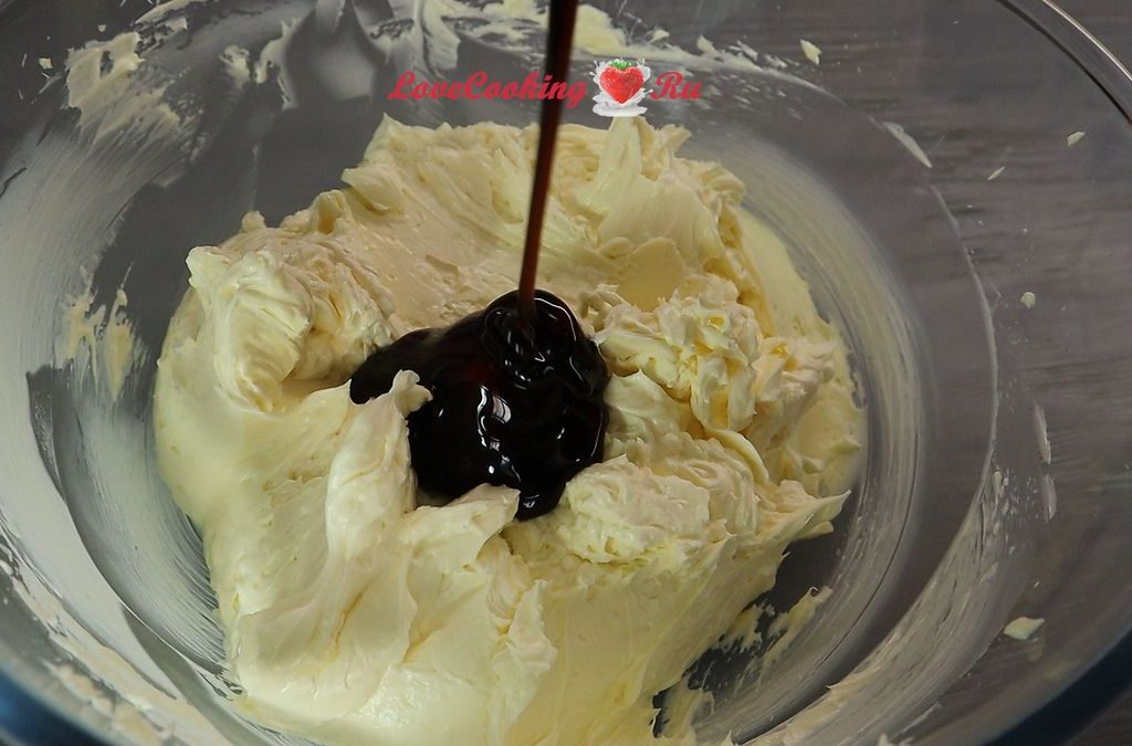 Когда получили однородную массу добавляем кофейный сироп и коньяк. Взбиваем.
