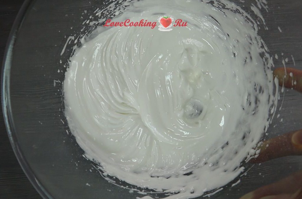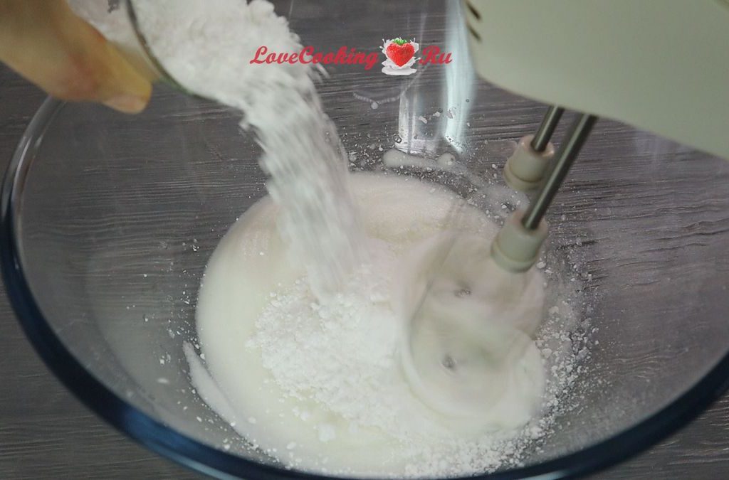 - Взбей белки до пышности, постепенно добавь сахарную пудру и увеличь скорость взбивания. Взбивай дальше до стойких пиков.