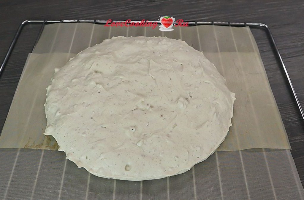 - Выложи на пергамент 2-3 меренговых коржа. Выпекай их в духовке 1.5-2 часа при 130 градусах и дай им полностью остыть.