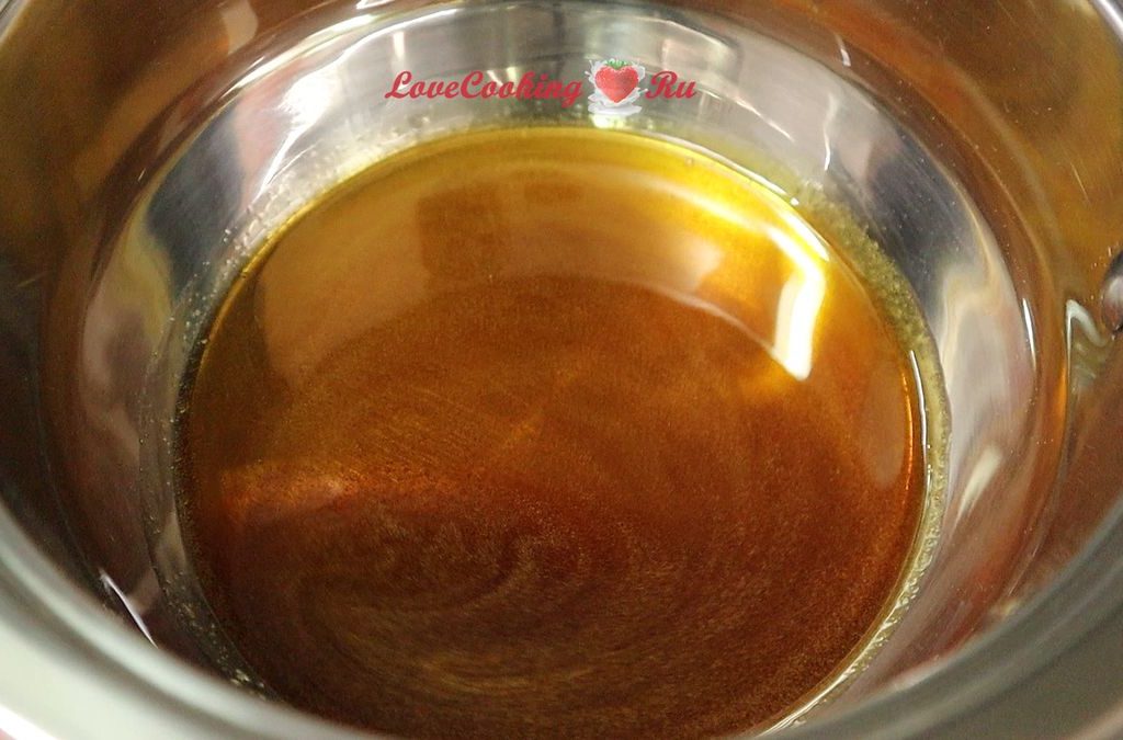 Сахар высыпаем в сотейник с толстым дном. Топим на медленном огне до равномерного золотистого цвета. Мешать его в этот момент нельзя, можно просто наклонять сотейник из стороны в сторону, чтобы сахар равномерно топился.