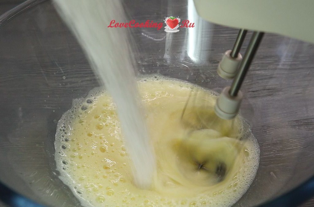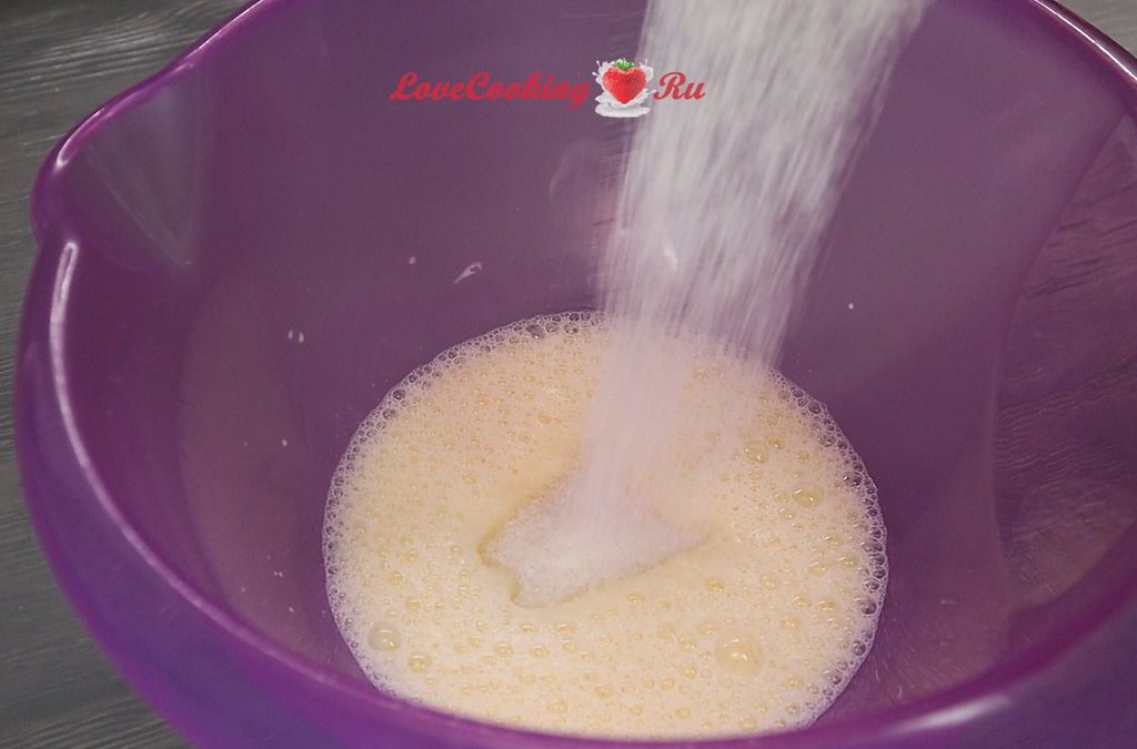 Смешиваем яйца с сахарным песком и ванильным сахаром венчиком