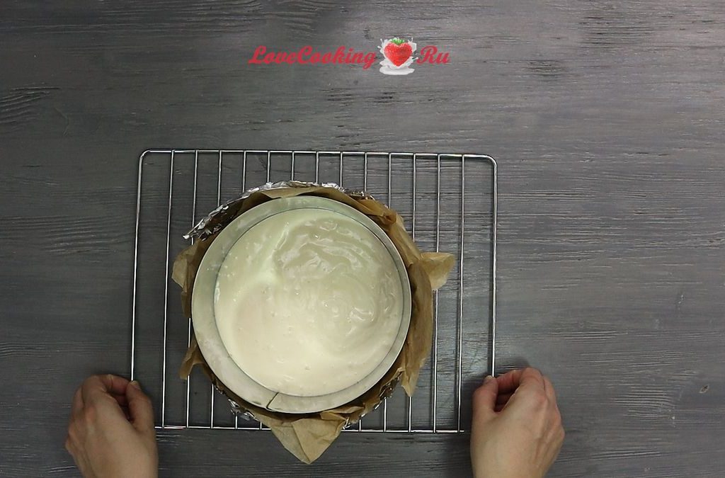 Расслоившийся крем помещаем в глубокую металлическую миску, нагреваем на водяной бане примерно до 30 градусов, масса станет чуть жидкой. Снимаем с водяной бани, снова взбиваем миксером на небольшой скорости.
