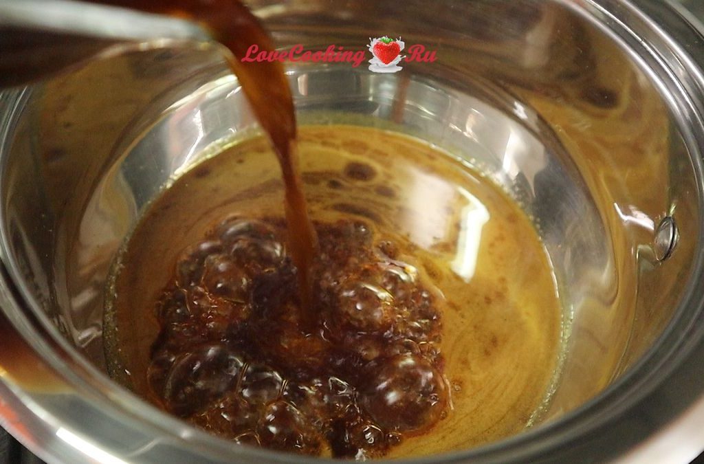 Выливаем кофе с растопленный сахар. Варим на среднем огне около 2 минут. Здесь уже помешивайте.